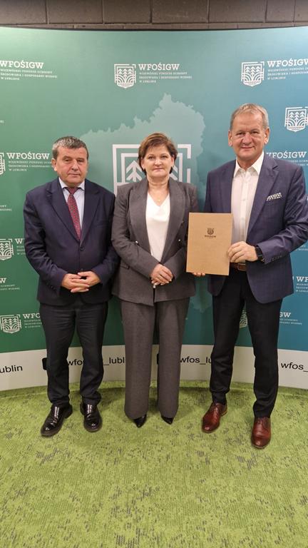 6 października 2025r. Wójt Gminy Janusz Pędzisz oraz Skarbnik Renata Mendel podpisali umowę z Wojewódzkim Funduszem Ochrony Środowiska i Gospodarki Wodnej w Lublinie reprezentowanym przez prezesa Stanisława Mazura na dofinansowanie termomodernizacji budynku remizy OSP w Suchodołach.