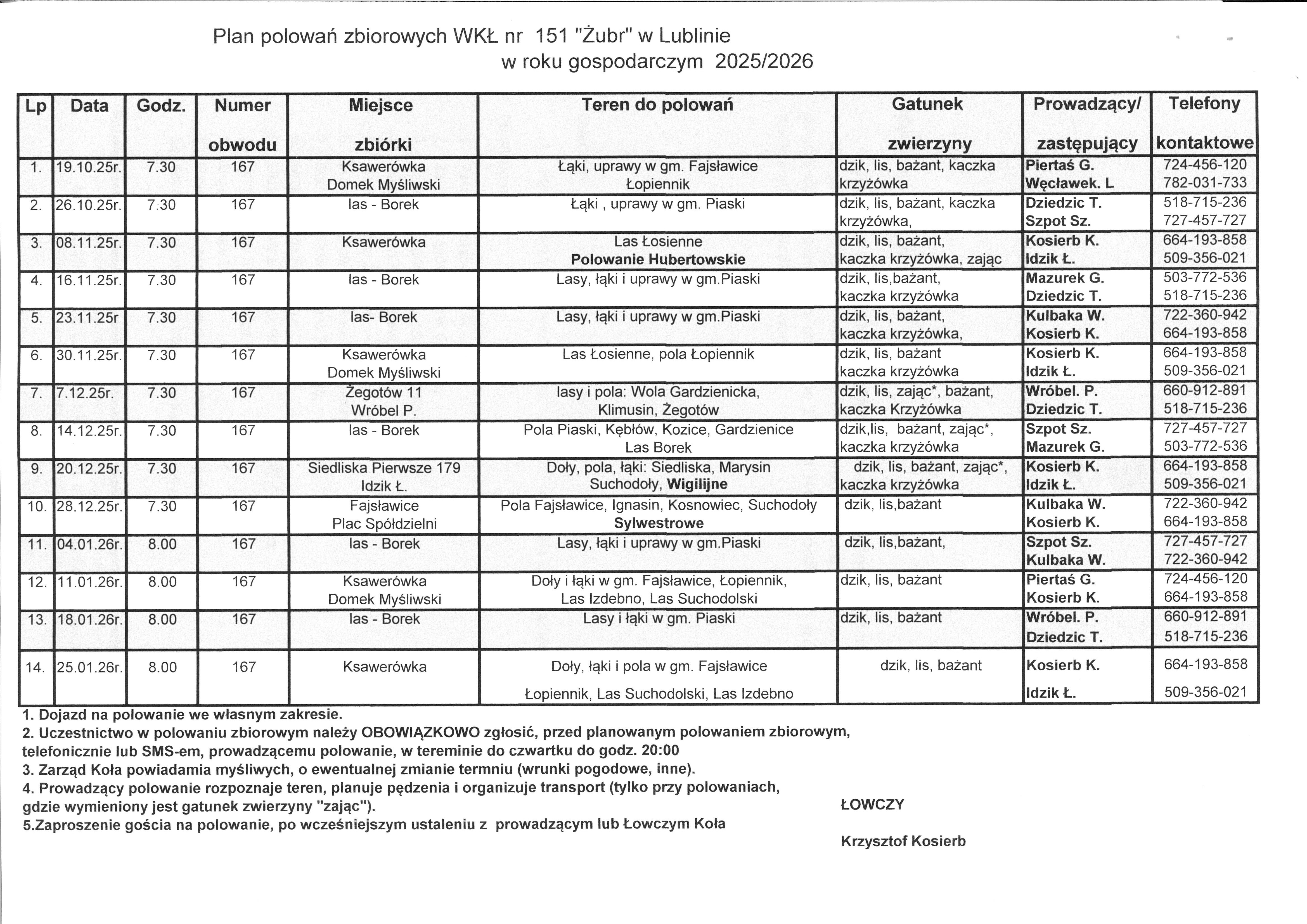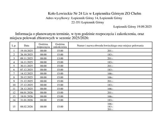 Wojskowe Koło Łowieckie Nr 151 "ŻUBR" w Lublinie oraz Koło Łowieckie Nr 24 Lis w Łopienniku Górnym ZO Chełm informują o planowanych terminach polowań zbiorowych w sezonie 2025/2026.