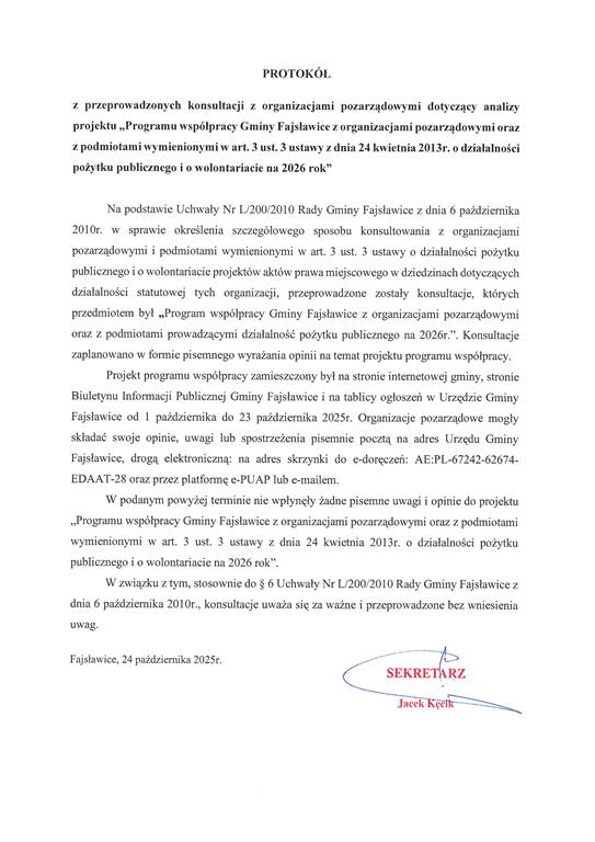 z przeprowadzonych konsultacji z organizacjami pozarządowymi dotyczący analizy projektu „Programu współpracy Gminy Fajsławice z organizacjami pozarządowymi oraz z podmiotami wymienionymi w art. 3 ust. 3 ustawy z dnia 24 kwietnia 2013r. o działalności pożytku publicznego i o wolontariacie na 2026 rok”