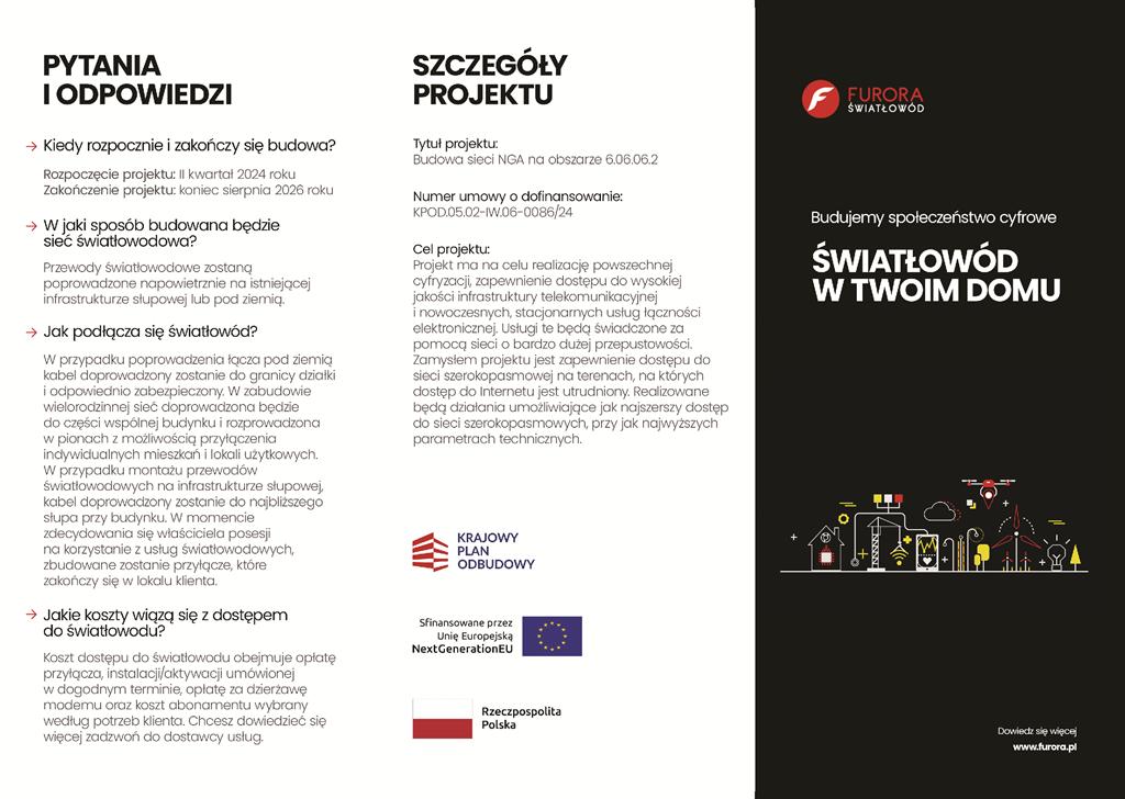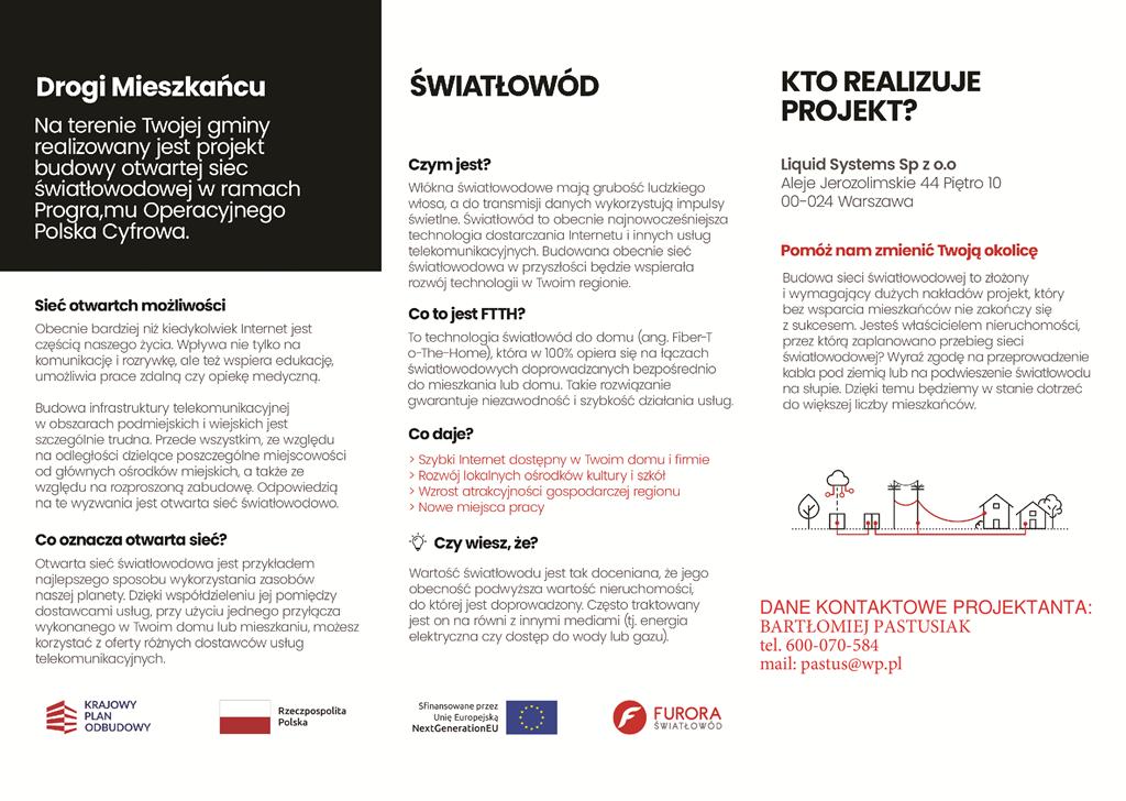 Firma Liquid System Sp. z o.o., Aleje Jerozolimskie 44, 00-024 Warszawa realizuje na terenie Gminy Fajsławice projekt budowy sieci światłowodowej – tytuł projektu: „Budowa sieci NGA na obszarze 6.06.06.2”.