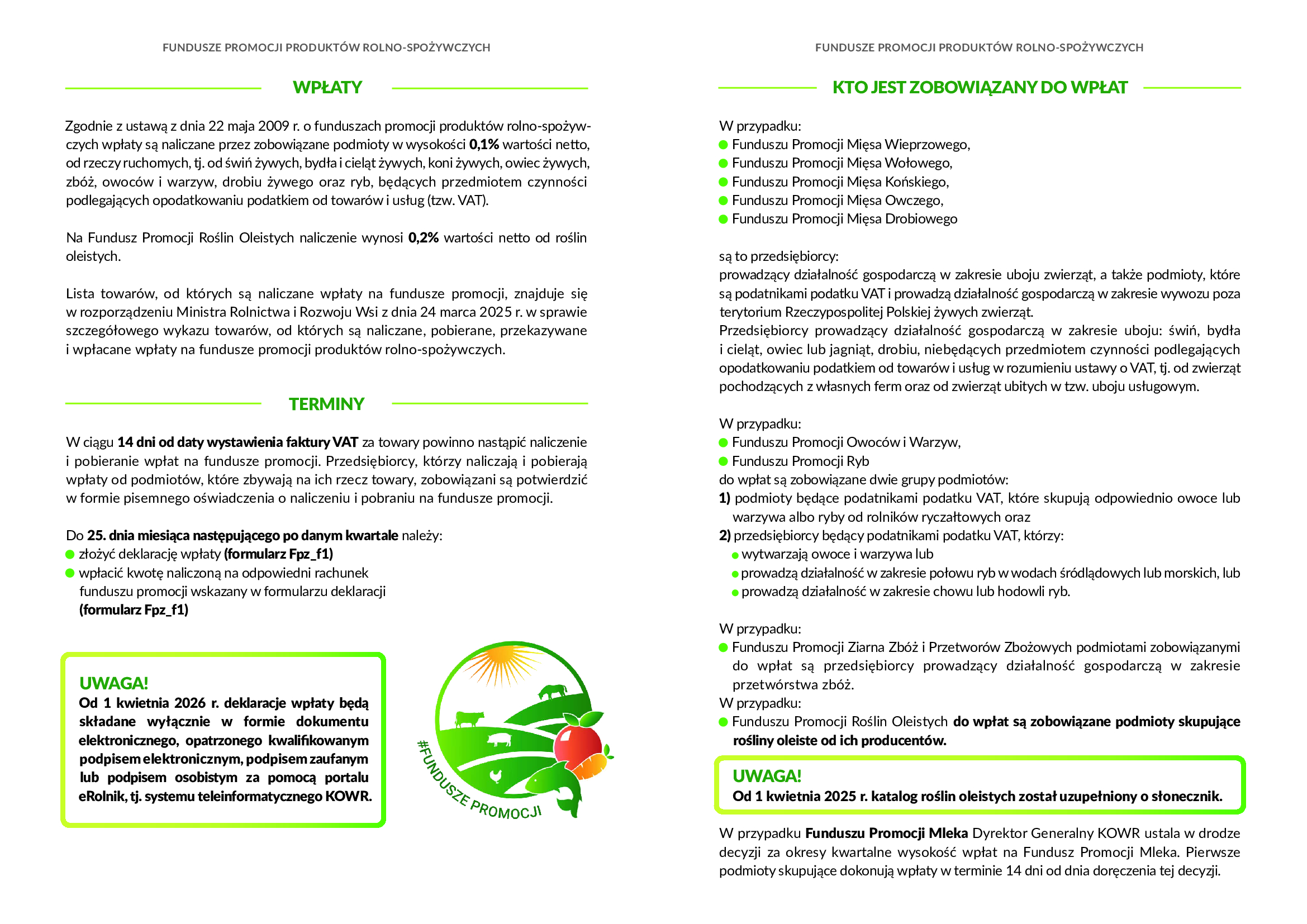 Krajowy Ośrodek Wsparcia Rolnictwa Oddział Terenowy w Lublinie informuje, że od 1 kwietnia 2026r.deklaracje wpłaty na fundusze promocji produktów rolno-spożywczych (formularz FPZ_f1), będą składane wyłącznie w formie dokumentu elektronicznego opatrzonego kwalifikowanym podpisem elektronicznym albo podpisem zaufanym, albo podpisem osobistym, za pomocą portalu eRolnik: https://erolnik.gov.pl/#/